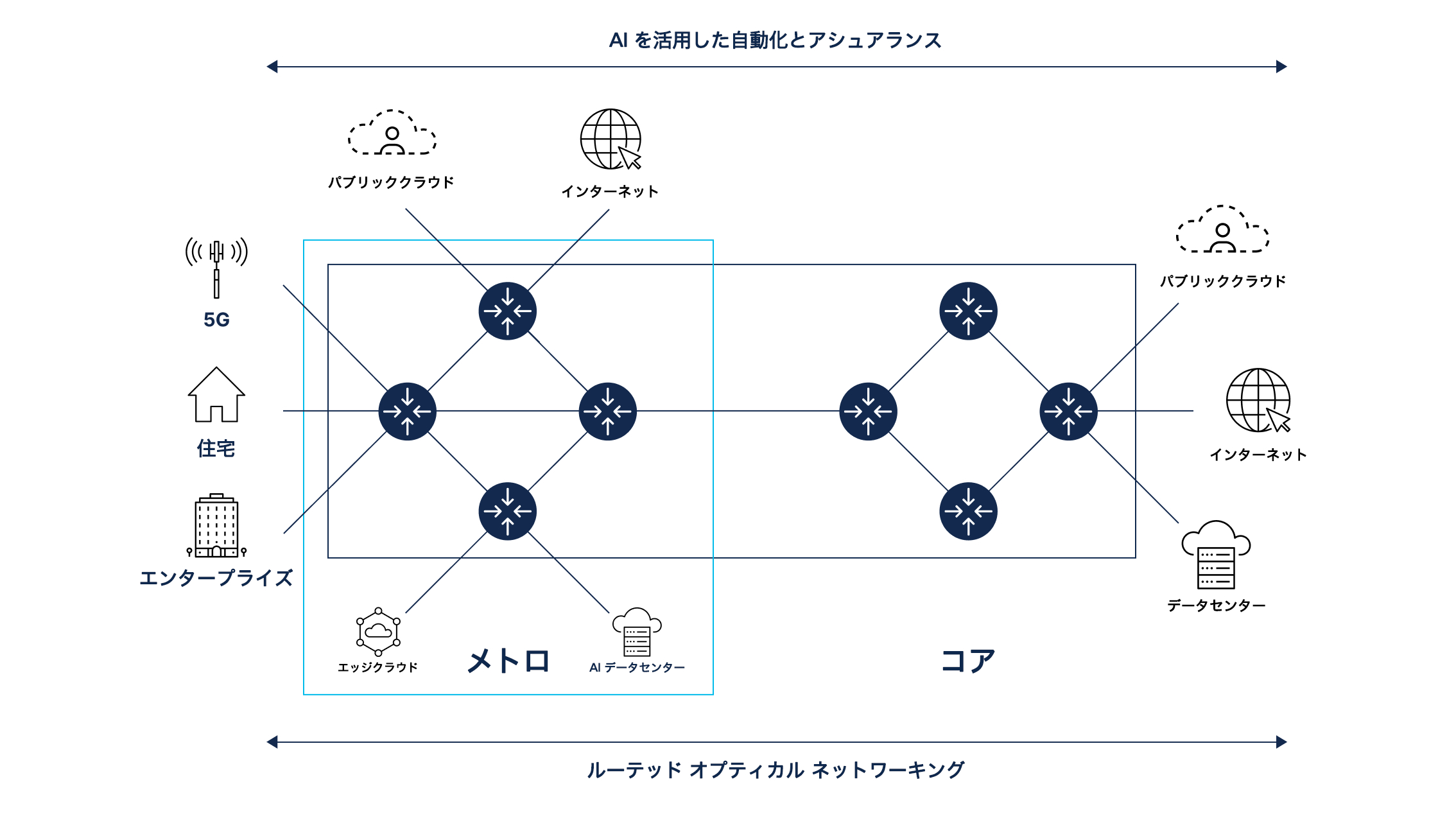 AI による分析で運用コストを削減し、ネットワークの最適化とトラブルシューティングのための予測的かつ処方的な自動化をサポートします。