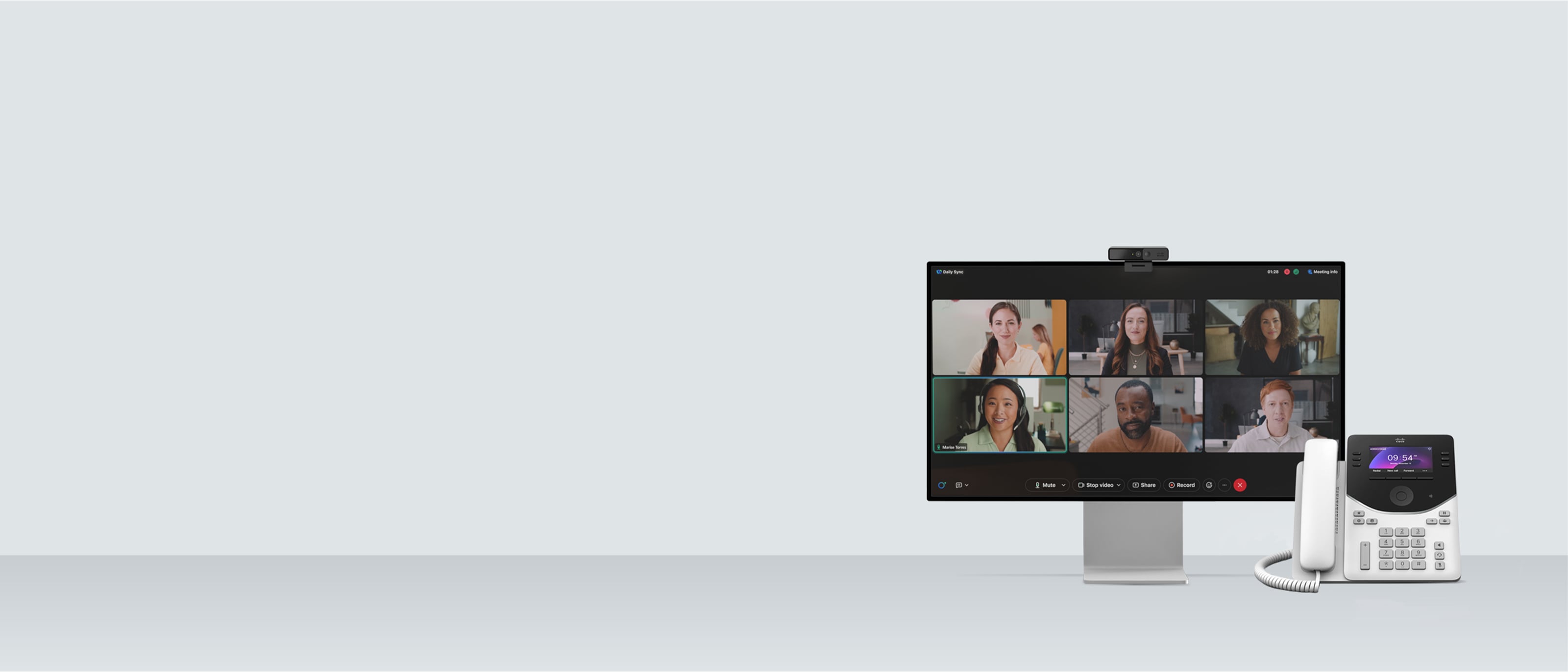 ​​​Aprovisione a sus equipos con el uso compartido de pantalla dinámica, el video HD y las funciones de participación impulsadas por inteligencia artificial. Cisco Webex Suite lo ofrece todo.​