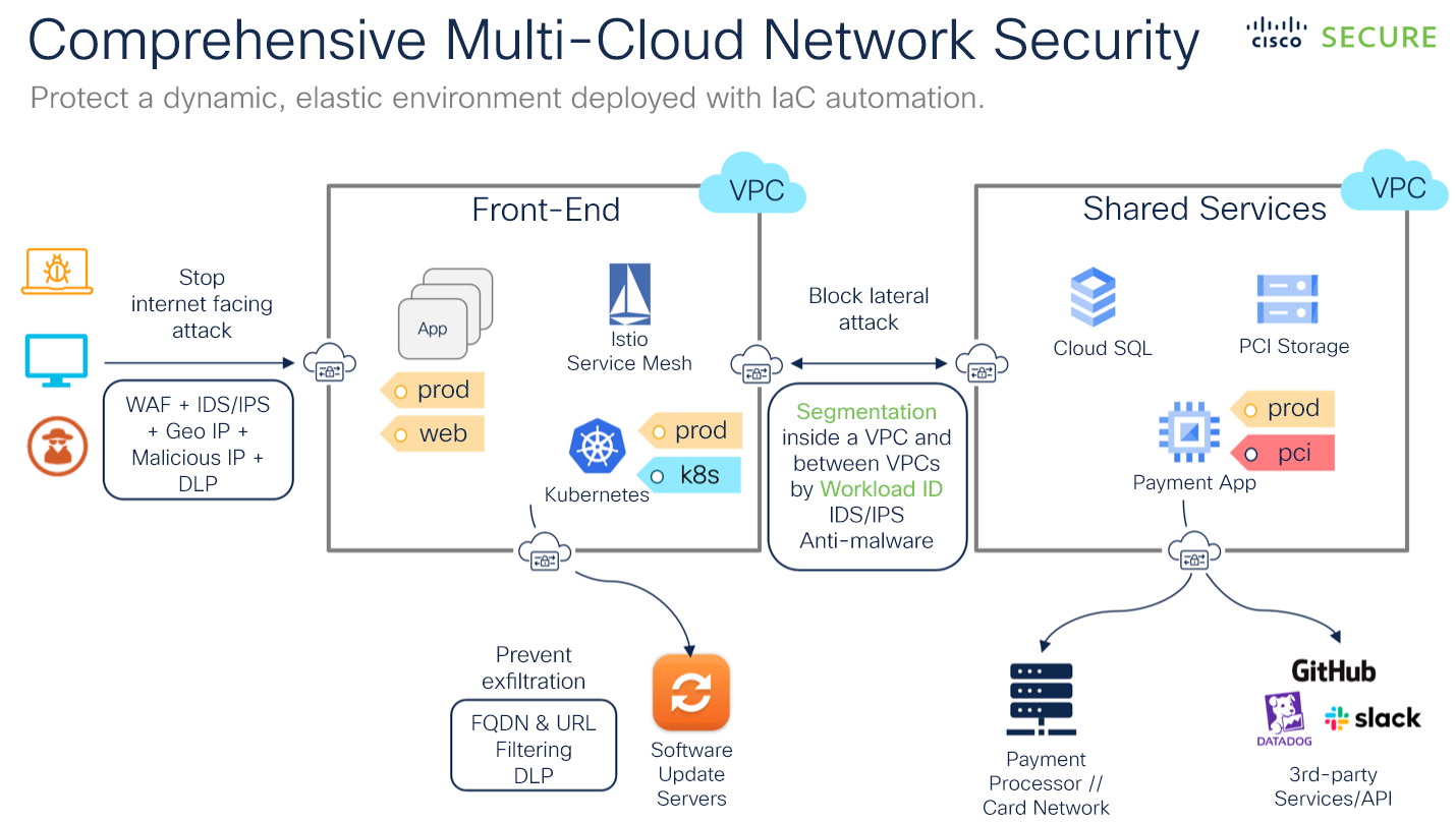 A solution with a thorough and robust feature set will reduce or eliminate the need for multiple point products and enable you to consolidate your cloud security. Look for critical capabilities such as dynamic policy enforcement, segmentation, network protection (cloud firewall) and web protection.