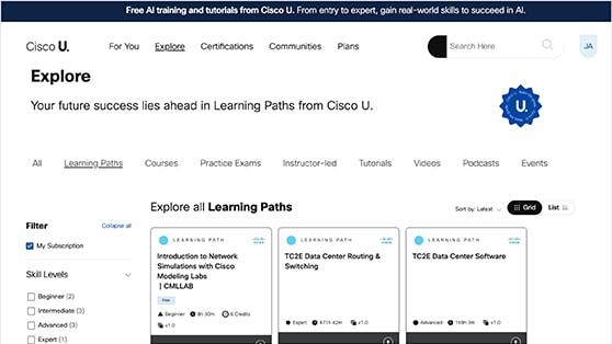 Learning Paths deliver guided training on complex concepts like designing cloud connectivity, network assurance, application development, and more.